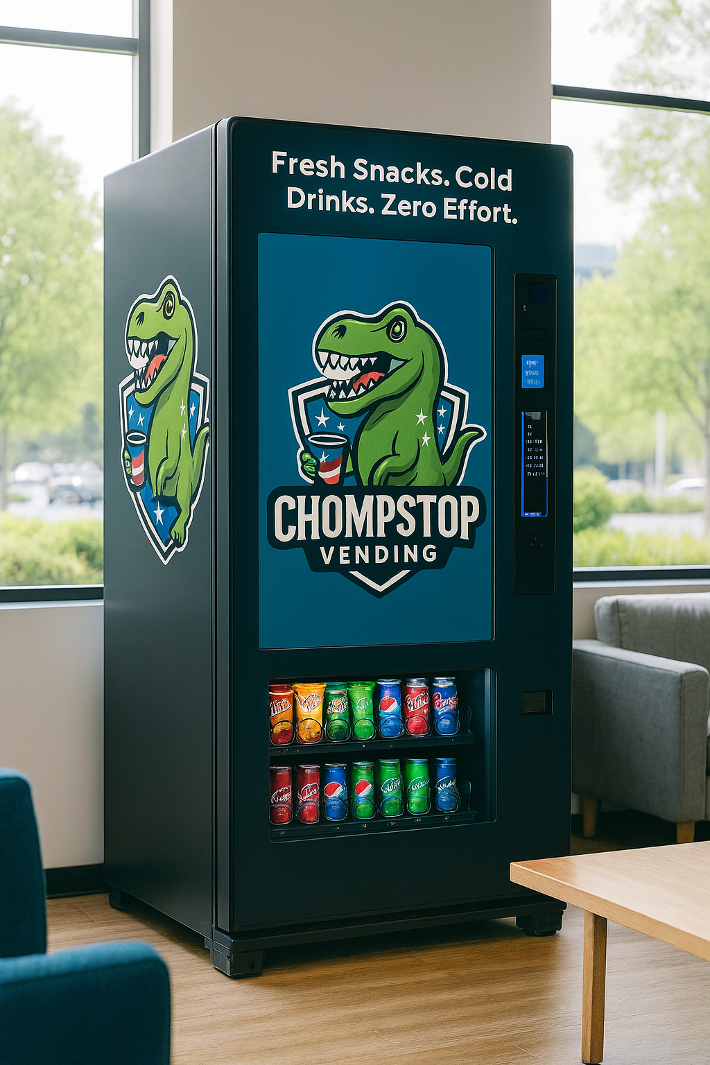Chompstop Vending, we bring convenient, reliable, and fully managed vending solutions to businesses of all sizes. From offices and warehouses to gyms, hotels, schools, and retail locations, our machines keep your employees and customers fueled throughout the day.